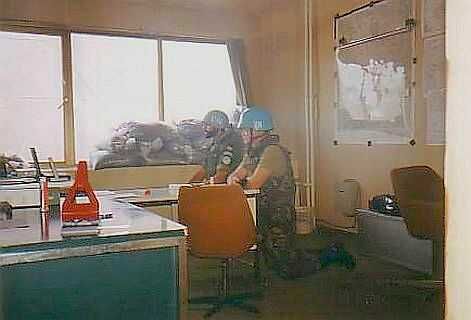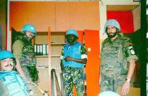 Voor de veiligheid had iedereen (fig») zijn helm op en het scherfvest aan. Het duurde even voordat er contact gelegd kon worden met de Servische liaison officier. Hem werd gevraagd waar ze in godsnaam mee bezig waren want de granaten kwamen langs en op ons gebouw terecht. Niet lang daarna verlegde men gelukkig het vuur in onze richting naar een ander deel van de enclave. Er was alleen wat schade op het dak van het gebouw. (van links naar rechts: Portugees, Nederlander, Keniaan en Spanjaard)