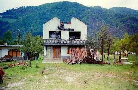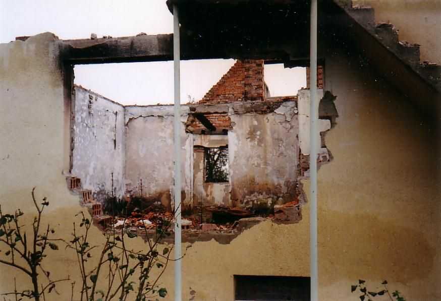 Veel huizen en gebouwen waren totaal verwoest. Toen onze groep de enclave binnen mocht komen, smeulden er nog een aantal na. Tijdens de dagelijkse rondgangen te voet en met een auto werden een aantal markante beschadigde onderkomens op de gevoelige plaat vastgelegd. Van het linkse huis was niet veel meer over en toch was het nog op de begane grond bewoond. De meeste inwoners hadden, zoals hier te zien is, een bescherming tegen granaatsplinters en inslagen aangebracht. Men plaatste planken en balken schuin voor de inmiddels ruitloze ramen. De rechtse "woning" was een bouwval maar kennelijk met bewoners, want er kwam rook uit de schoorsteen. Overigens viel het op dat de meeste huizen niet beschadigd waren door gevechtshandelingen, maar door brandstichting of springmiddelen. De katholieke kerk en begraafplaats ondergingen hetzelfde lot.