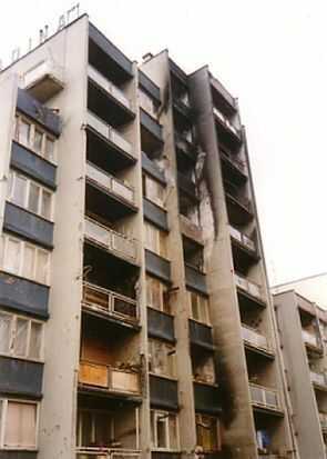 School met verwaaid folie als vervanger voor glas. Het flatgebouw was ook nog behoorlijk bewoond.